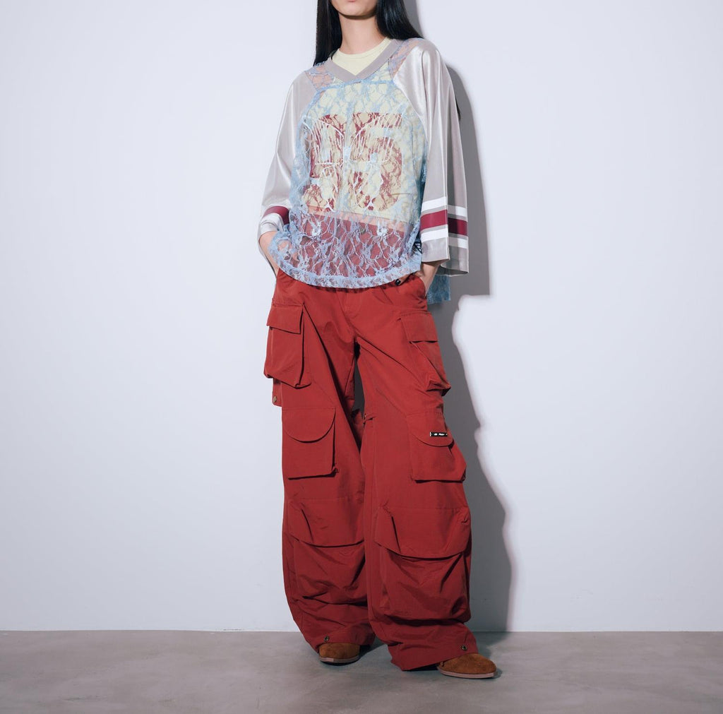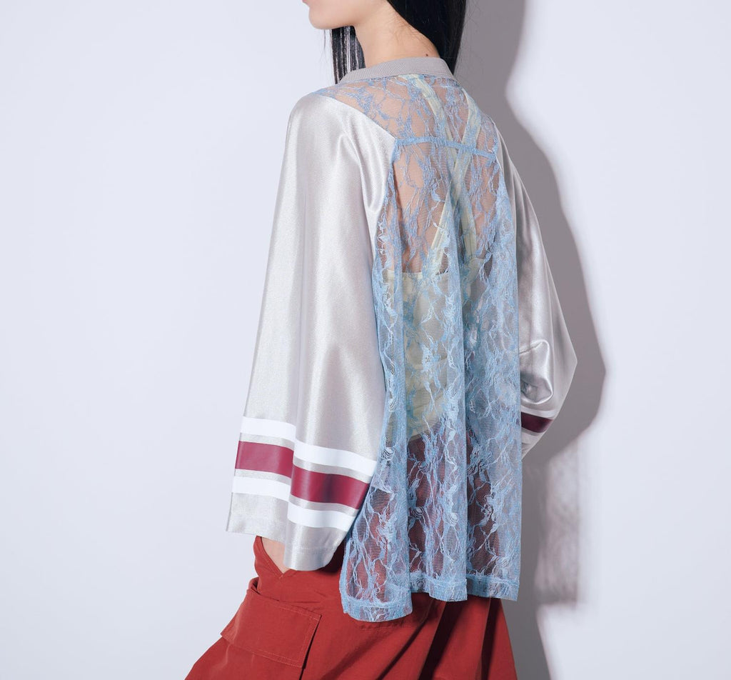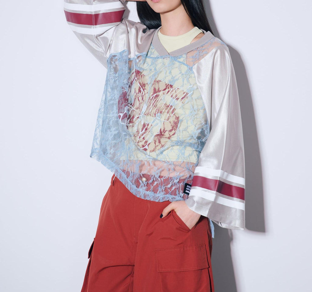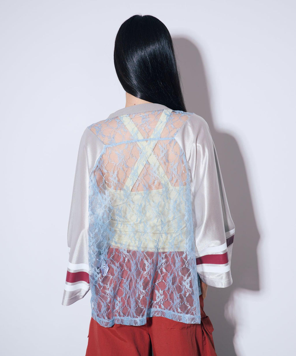 ANNA SUI NYC的經典遊戲襯衫搭配蕾絲,展現運動感與性感氛圍並存的一件。透膚蕾絲上,大膽地配置的數字和蝴蝶圖案印花,絕對在街頭吸睛。具有光澤感的制服風格素材和線條印花等運動細節,與細膩蕾絲的對比營造出新鮮的平衡感。根據內搭的不同,印象也會改變,層次搭配的穿法也很有趣。顏色有黑色、棕色和銀色三種。每種都擁有不同的世界觀,是令人想要一併擁有的多色系列。
