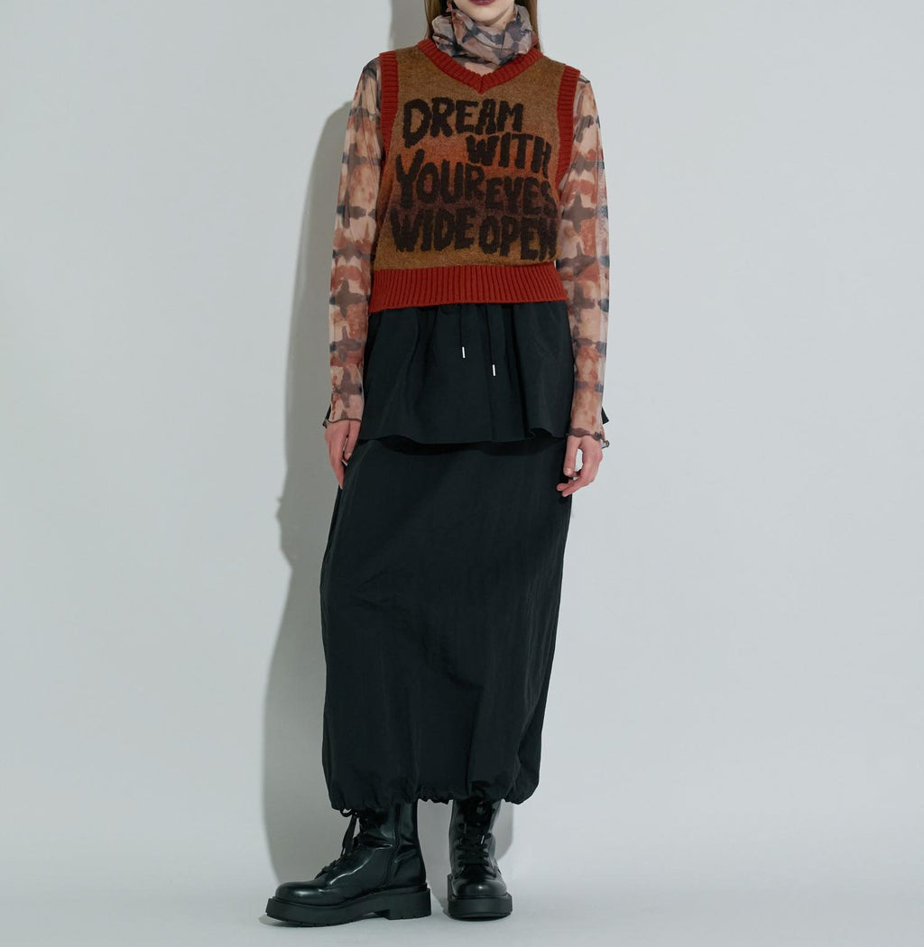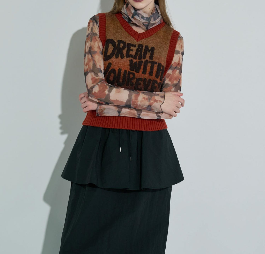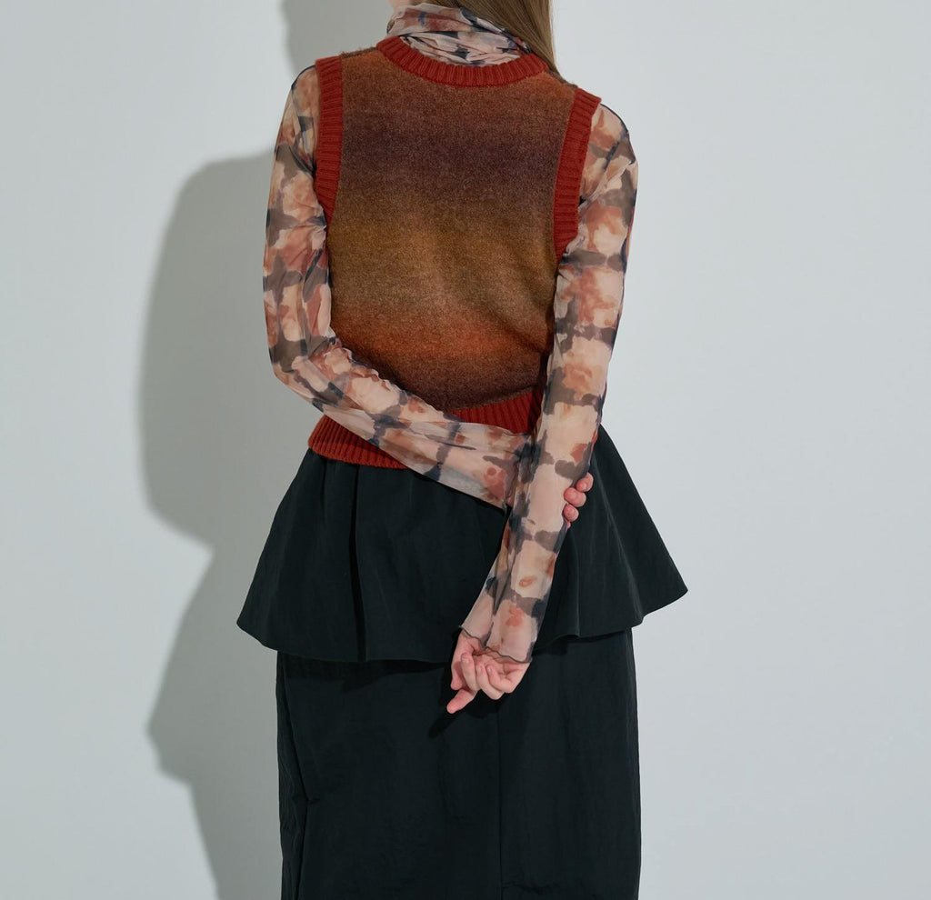 以長長的領口設計為特色的長款高領,帶有細膩色調的薄紗上衣。蓬鬆隨意的皺褶領口,為造型增添空氣感和立體感。獨特的色調如水彩般搖曳的色彩,為搭配增添藝術氣息。顏色有沉穩的黑色和散發復古氛圍的藍色兩種選擇。兩者都能單穿出彩,也適合作為層次內搭,展現存在感。建議搭配背心裙或背心作為內搭,巧妙融入時尚元素。無論季節都適用,擴展造型的可能性。