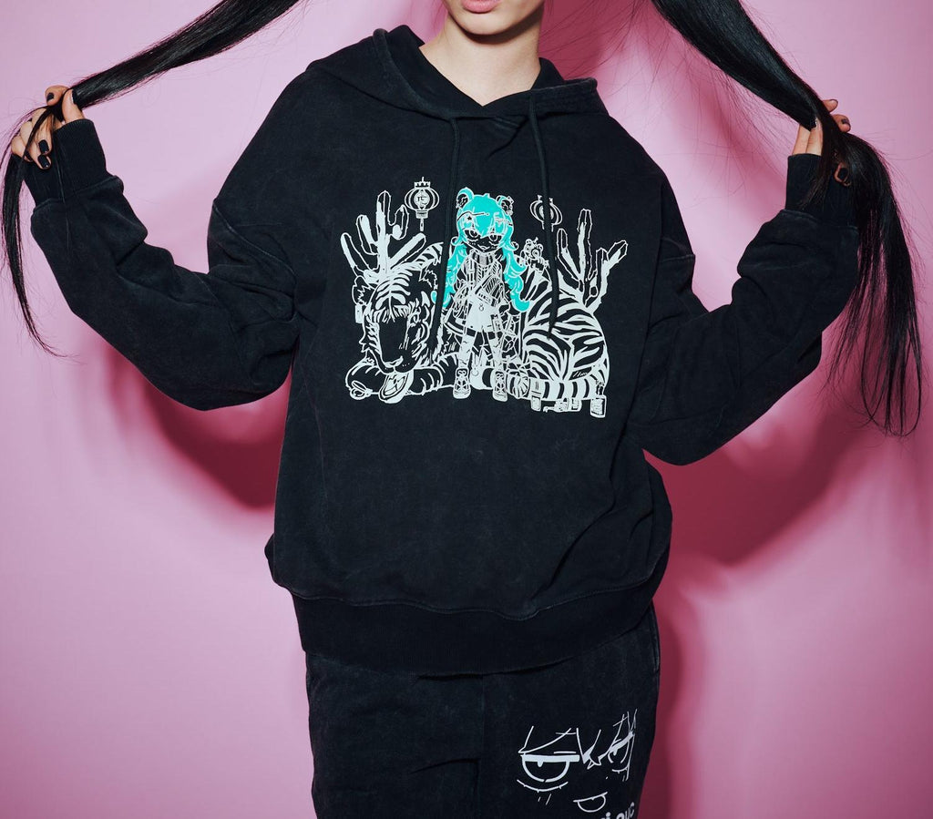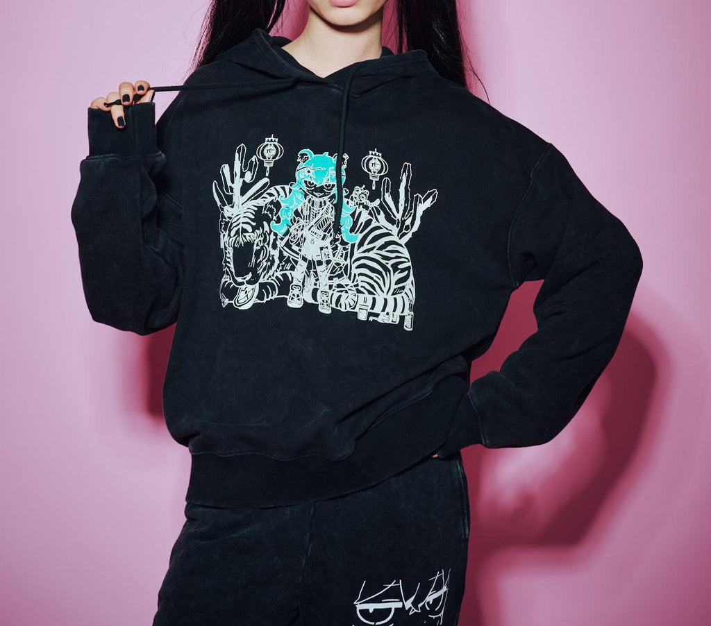 數位創作者 寺田てらさん與ANNA SUI NYC的特別合作。將寺田てらさん的特色之一——多彩的藝術作品,特意用單色調和點綴色兩色來表現。街頭感與藝術性融合,展現獨一無二的存在感。身體部分採用化學漂白和過度染色加工,呈現出趨勢感十足的表情。顏色方面,提供令人印象深刻的粉色和典雅的黑色兩種選擇。也推薦與同系列的“TERA運動褲”搭配穿著。