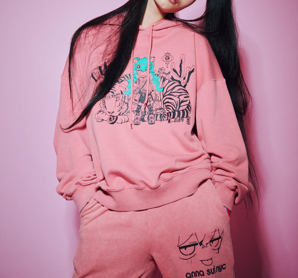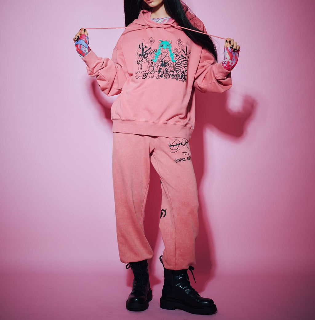 數位創作者 寺田てらさん與ANNA SUI NYC的特別合作。將寺田てらさん的特色之一——多彩的藝術作品,特意用單色調和點綴色的兩色來表現。街頭感與藝術性融合,展現獨一無二的存在感。身體部分採用化學漂白和過度染色加工相結合,呈現出趨勢感十足的表情。顏色方面,提供令人印象深刻的粉色和典雅的黑色兩種選擇。也推薦與同系列的“TERA運動褲”搭配穿著。