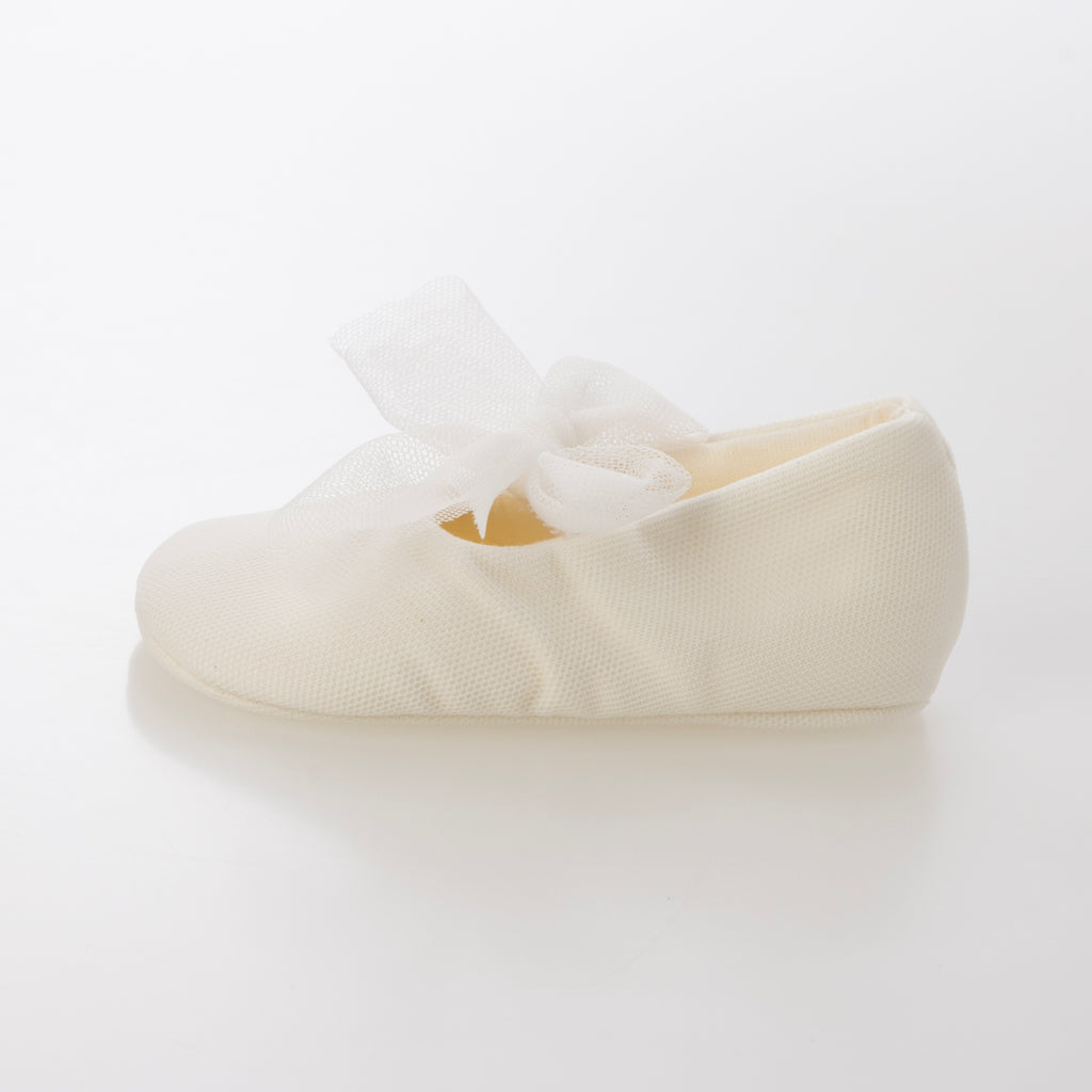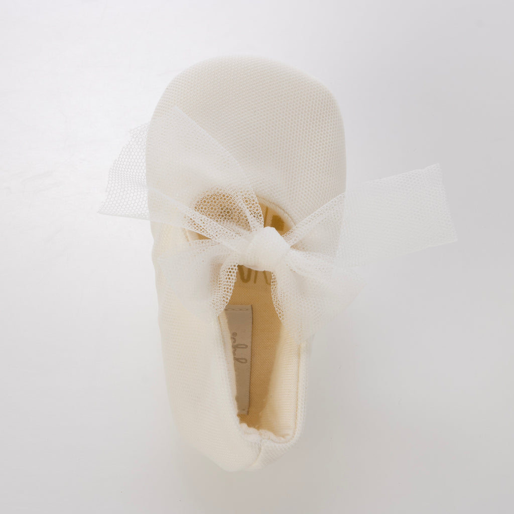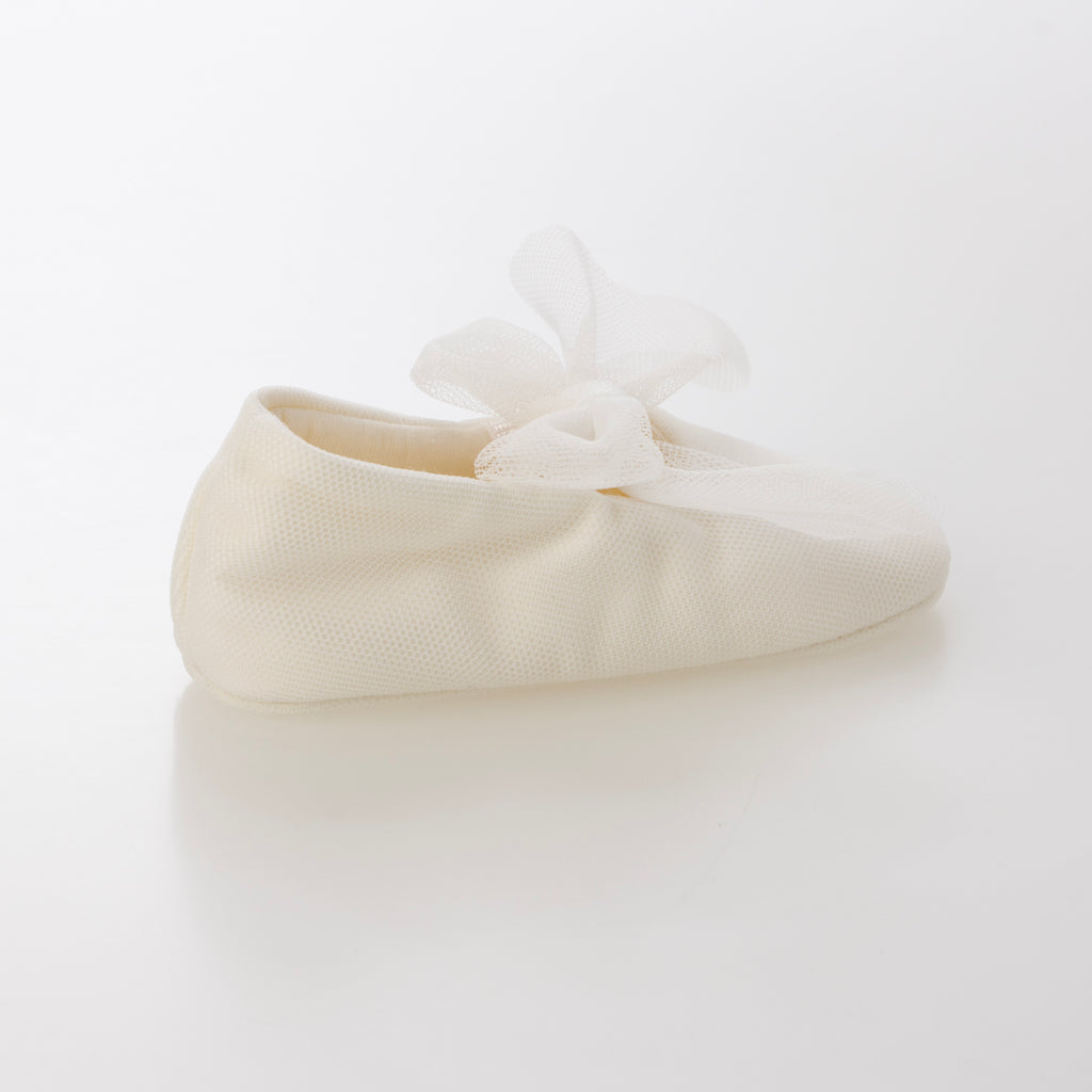 用蕾絲材質製成的緞帶為嬰兒鞋增添華麗感。